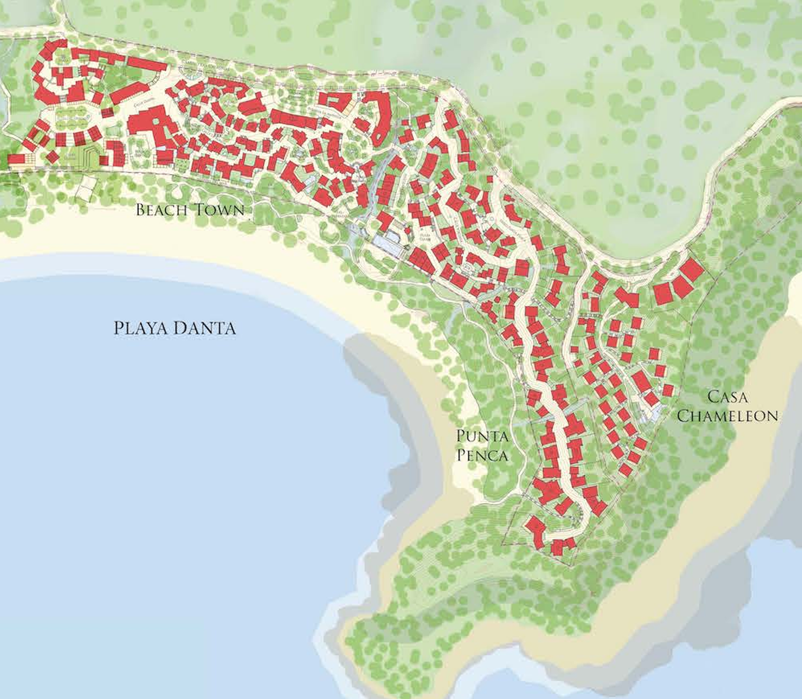 Las Catalinas is a beautiful place composed of houses, shops, restaurants, small hotels and inns, pedestrian streets, plazas, parks, and recreational facilities. All elements are arranged to produce a series of wonderful, walkable public spaces interwoven with the natural environment. The architecture is adapted for outdoor living. Motorized vehicles are refreshingly absent. The comings and goings of residents and visitors enrich the scene. Every street leads to an overlook of the picturesque landscape. Each home frames incredible views.